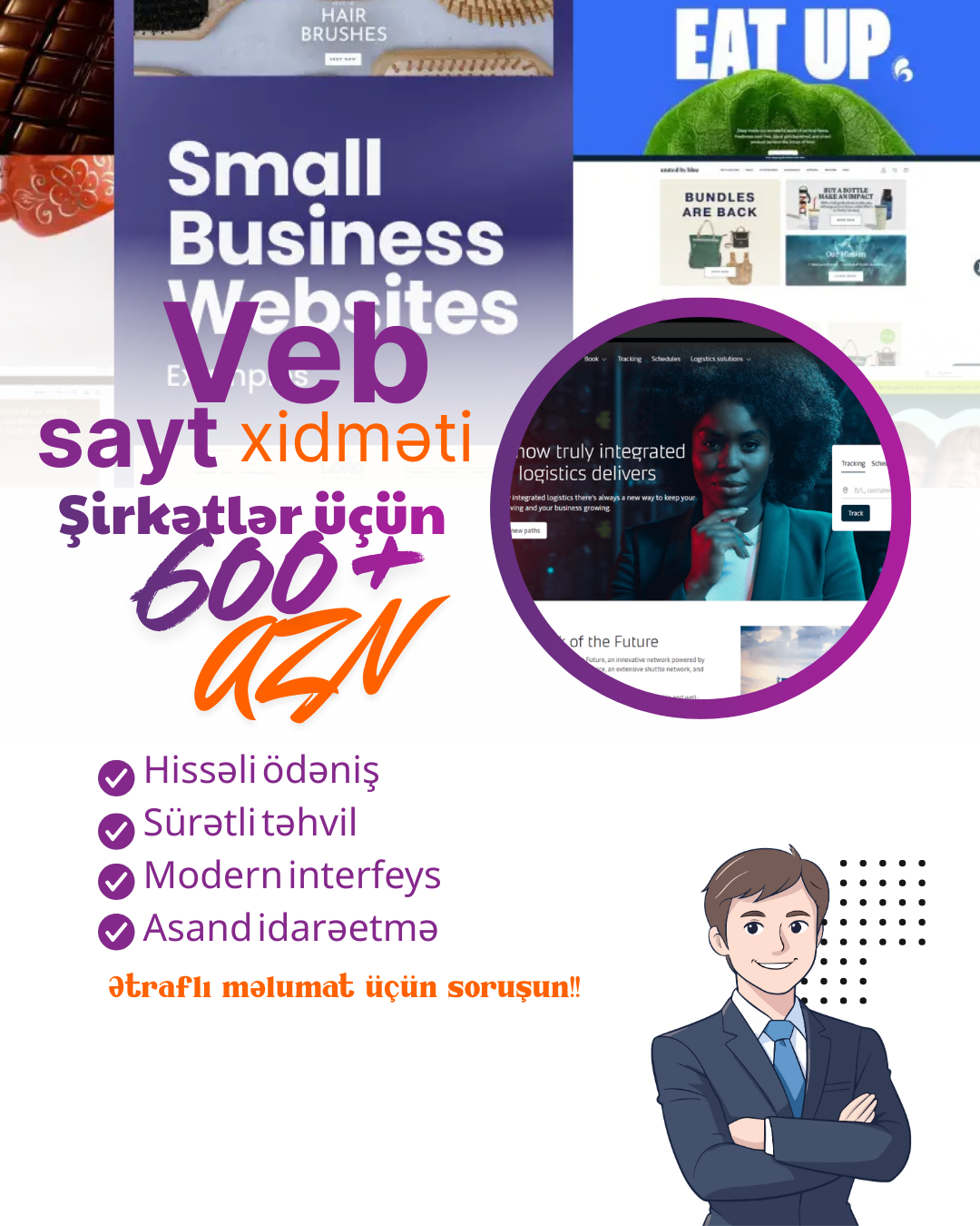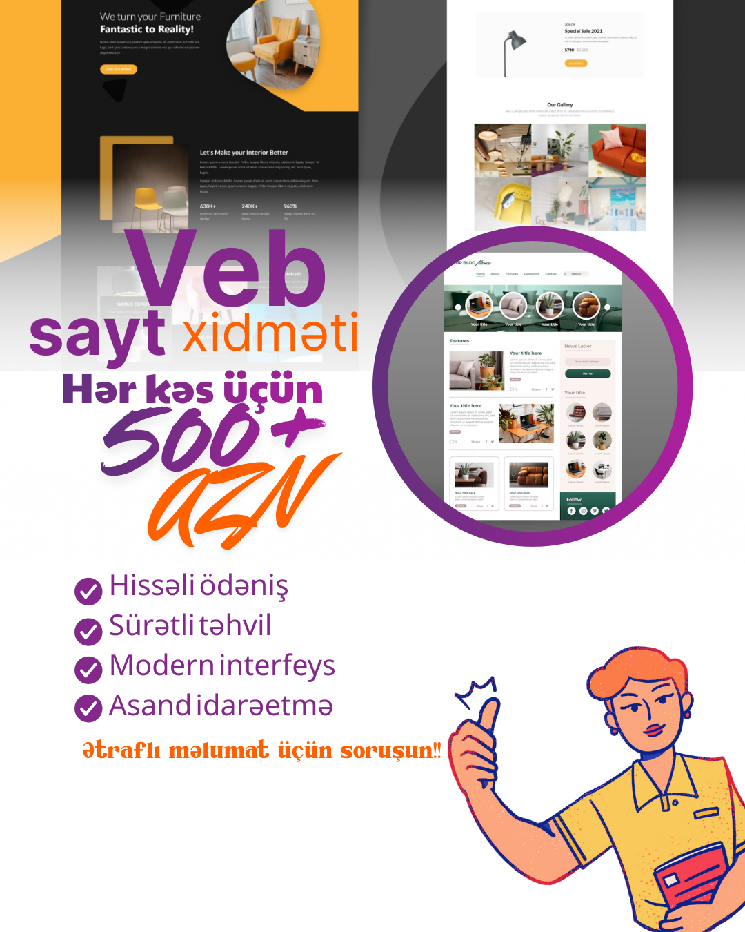 Biznesinizi qlobal dünyaya açmaq və müştəri bazanızı genişləndirmək istəyirsiniz? Biz sizə şablonlardan uzaq, tamamilə sizin istəklərinizə uyğun, unikal və yüksək texnologiyalı veb layihələrin hazırlanmasını təklif edirik.Həm kiçik bizneslər, həm də böyük şirkətlər üçün uyğun həllərimiz var.💻 Texniki imkanlarımız: Saytlar PHP (Laravel) üzərində qurulur. Bu nə deməkdir?Maksimum Sürət: Saytınız saniyələr içində açılır.Yüksək Təhlükəsizlik: Saytınızın "sındırılması" və ya virusa yoluxması riskini minimuma endiririk.Genişləndirmə İmkanı: Gələcəkdə sayta istənilən yeni funksiyanı əlavə edə bilərik.🌐 Hazırladığımız sayt növləri:Korporativ Saytlar: Şirkətlər üçün imic formalaşdıran rəsmi səhifələr.E-Ticarət (Online Satış): Məhsul kataloqu, səbət və onlayn ödəniş sistemi.Elan və Xidmət Saytları: Mürəkkəb axtarış sisteminə malik portallar.Fərdi Layihələr (Startaplar): Sizin ideyanıza uyğun xüsusi sistemlərin yazılması.🎁 Hədiyyə: Sayt sifarişi zamanı 1 illik texniki dəstək, domen/hostinq məsləhətləri və ilkin SEO (Google) optimallaşdırması təmin edilir.Gördüyümüz işə tam zəmanət veririk. Qiymət və detalları danışmaq üçün elandakı nömrəyə zəng edə və ya WhatsApp vasitəsilə yaza bilərsiniz.